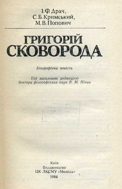 5. Григорій Сковорода : біогр. повість / авт.: І. Ф. Драч, С. Б. Кримський, М. В. Попович ; під заг. ред. В. М. Нічик. – Київ : Молодь, 1984. – 214 с. : іл. – (Уславлені імена ; вип. 60).