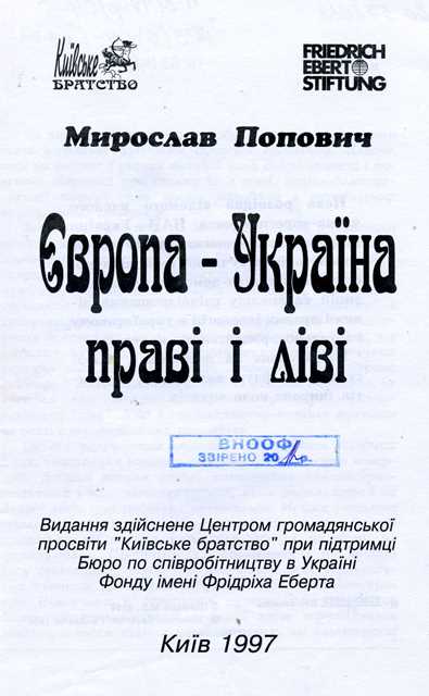 12. Європа – Україна: праві і ліві / Мирослав Попович ; Центр громадян. просвіти «Київ. Братство», Фонд ім. Фрідріха Еберта. – Київ, 1996. – 105 с.